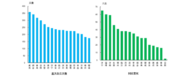 “藍(lán)天白云,繁星閃爍”天數(shù)最多的城市是威海市,為359天,最少的是聊城市,為174天。同比增加最多的是濟(jì)寧市,為65天。