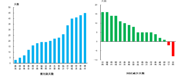重污染天數(shù)出現(xiàn)最少的是威海市,為3天,最多的是德州市,為45天。重污染天數(shù)同比減少最多的是濟(jì)南和淄博市,為16天;同比增加最多的是日照市,為8天。