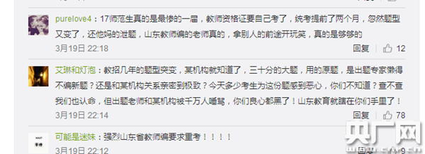 19日當(dāng)天考試結(jié)束后,參加教育類考試的考生就在山東省教育廳和山東省教育招生考試院的官方微博上反映,這次考試的試題與某考試機(jī)構(gòu)的部分原題相同。網(wǎng)友@艾琳和燈泡說:“教招幾年的題型突變,某機(jī)構(gòu)就知道了,三十分的大題,用的原題,是出題專家懶得不編新題?還是和某機(jī)構(gòu)關(guān)系親密到極致?今天多少考生為這份題感到惡心,你們不知道?查不查我們也認(rèn)命,但出題老師和某機(jī)構(gòu)被千萬人唾罵,你們良心都黑了!山東教育就瞎在你們手里了!”
