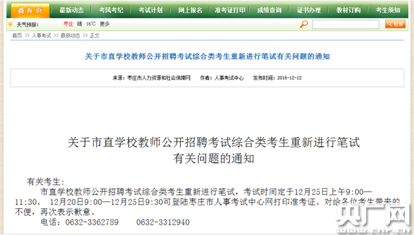 2016年,山東廣播電視臺報(bào)道稱,2016年12月10日舉行的棗莊市教育局直屬學(xué)校第二次招聘考試筆試考試出現(xiàn)雷同試題。對此,棗莊市人力資源和社會保障局發(fā)布《關(guān)于市直學(xué)校教師公開招聘考試綜合類考生重新進(jìn)行筆試的通知》。通知稱,經(jīng)調(diào)查核實(shí),12月10日上午進(jìn)行的市直學(xué)校教師公開招聘考試綜合類試題,因委托外省的命題機(jī)構(gòu)工作疏忽,存在與往年試題部分重復(fù)的問題。為體現(xiàn)公平公正,對廣大考生負(fù)責(zé),經(jīng)研究決定,對參加市直學(xué)校教師公開招聘綜合類考試的考生重新組織筆試,免收考試費(fèi)用,具體考試時(shí)間另行通知。
