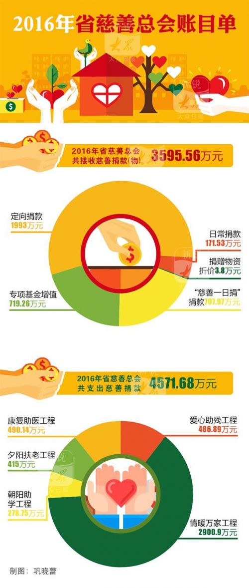 2016年山東省慈善總會(huì)共支出慈善捐款4571.68萬(wàn)元,占上年可支配善款90.19%。其中,(一)朝陽(yáng)助學(xué)工程支出278.75萬(wàn)元,包括向在校特困大學(xué)生支付救助款26.9萬(wàn)元;向父母外出打工且家庭貧困的留守兒童支付項(xiàng)目款101.85萬(wàn)元;山東移動(dòng)獎(jiǎng)學(xué)金定向助學(xué)款70萬(wàn)元;利群陽(yáng)光、偉東置業(yè)等開展的定向助學(xué)款80萬(wàn)元。(二)夕陽(yáng)扶老工程支出415萬(wàn)元,包括貧困老年性白內(nèi)障患者救助項(xiàng)目手術(shù)款100萬(wàn)元;為全省農(nóng)村敬老院、幸福苑支付夕陽(yáng)溫暖工程項(xiàng)目款315萬(wàn)元。(三)康復(fù)助醫(yī)工程支出490.14萬(wàn)元,包括支付先心病項(xiàng)目救助款66.99萬(wàn)元;支付貧困尿毒癥患者親體腎移植項(xiàng)目捐款224萬(wàn)元;支付貧困尿毒癥患者血液透析項(xiàng)目救助款199.15萬(wàn)元。(四)愛心助殘工程支出486.89萬(wàn)元,包括向貧困殘疾人支付康復(fù)訓(xùn)練及診療費(fèi)212.6萬(wàn)元;支付貧困唇腭裂患者救助項(xiàng)目手術(shù)費(fèi)260.66萬(wàn)元;支付中華慈善總會(huì)—美國(guó)LDS慈善協(xié)會(huì)輪椅項(xiàng)目款9.63萬(wàn)元;支付定向救助貧困演技患者診療費(fèi)4萬(wàn)元。(五)情暖萬(wàn)家工程支出2900.9萬(wàn)元,包括全省特困企業(yè)職工家庭救助款1348.7萬(wàn)元;特困省直機(jī)關(guān)職工救助237.5萬(wàn)元;特困軍人家庭救助款38萬(wàn)元;特困檢察人員家庭救助款100萬(wàn)元;特困公安英烈家庭救助款100萬(wàn)元;特困銀行業(yè)職工家庭救助款170萬(wàn)元;特困群眾生活救助款601.74萬(wàn)元;定向扶貧救助款304.96萬(wàn)元。