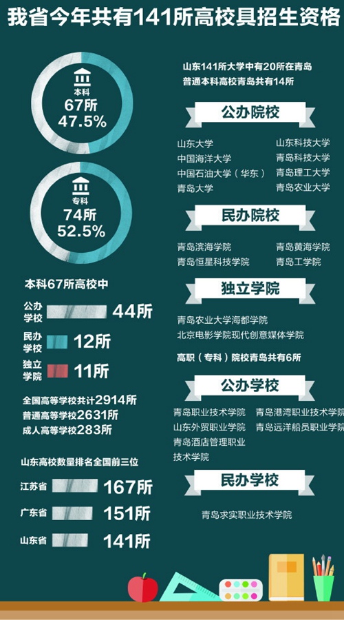 為維護(hù)廣大普通高考考生的合法權(quán)益,維護(hù)我省高等教育的良好社會(huì)信譽(yù),指導(dǎo)廣大考生正確選擇報(bào)考我省高等學(xué)校。6月15日,山東省教育廳將2017年山東省具有普通高等學(xué)歷教育招生資格的高等學(xué)校名單予以公告。今年山東省具有普通高等學(xué)歷教育招生資格的高校共有141所。