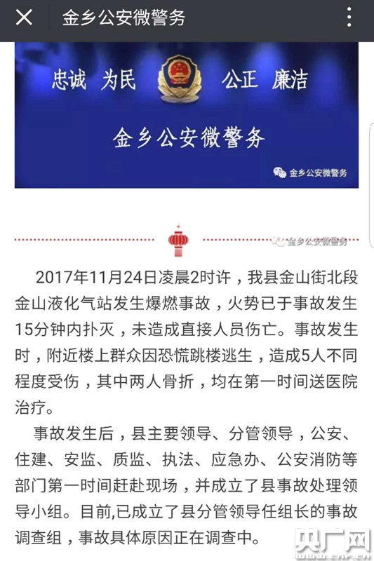 11月24日,記者從濟(jì)寧市金鄉(xiāng)縣公安局官方微信獲悉,2017年11月24日凌晨2時(shí)許,濟(jì)寧市金鄉(xiāng)縣金山街北段金山液化氣站發(fā)生爆燃事故,火勢已于事故發(fā)生15分鐘內(nèi)撲滅,未造成直接人員傷亡。事故發(fā)生時(shí),附近樓上群眾因恐慌跳樓逃生,造成5人不同程度受傷,其中2人骨折,均在第一時(shí)間送醫(yī)院治療。