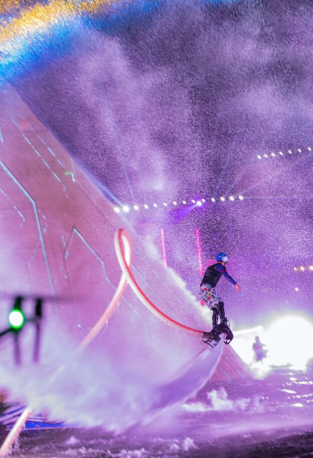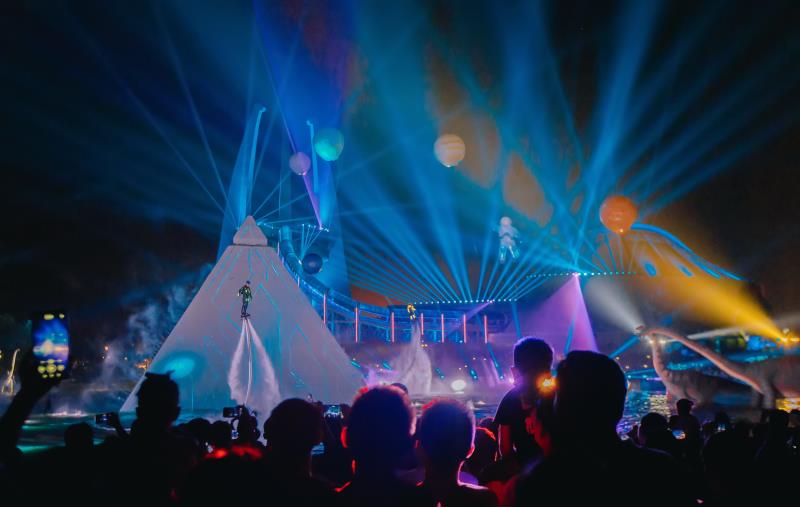 為打造全方位的沉浸式效果,《D秀》團隊歷時一年多的技術(shù)研發(fā),以數(shù)字多媒體聲光演藝為主要手段,以中華恐龍館為核心,對周圍的空間格局、觀演環(huán)境等進行了全方位的考量。在精心挑選的位置上新增了數(shù)百個全新的燈光效果裝置,力求從觀眾入場開始,就能夠根據(jù)故事節(jié)奏設置,營造不同的現(xiàn)場氛圍,并能夠配合劇情發(fā)展,帶來進一步升級的觀賞感受。其中,為《D秀》特別定制的水中升降三維立體數(shù)字光影裝置也震撼亮相,成為了此次大秀的點睛之筆。