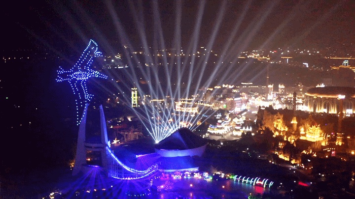 ▲賽博坦星球的宇宙戰(zhàn)艦,點(diǎn)亮中華恐龍園上空。