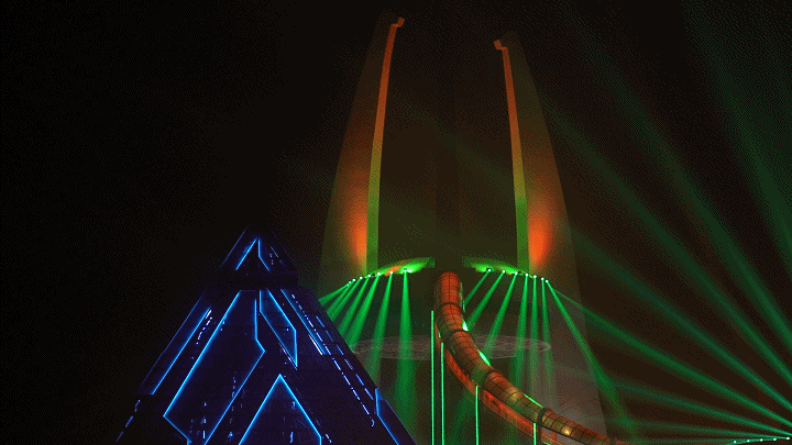 據(jù)悉,這座科技感十足的金字塔,是中華恐龍園IP故事中能量源泉“火龍石”的具象體現(xiàn),正因火龍石迸發(fā)出“愛(ài)與希望”的神奇力量,才使得恐龍能夠跨越時(shí)間與空間,到達(dá)與人類和諧共處的奇異位面。該裝置是《D秀》的重要亮點(diǎn),也是整場(chǎng)秀在技術(shù)層面難度最高的部分,體現(xiàn)了濃重的現(xiàn)代藝術(shù)風(fēng)格。