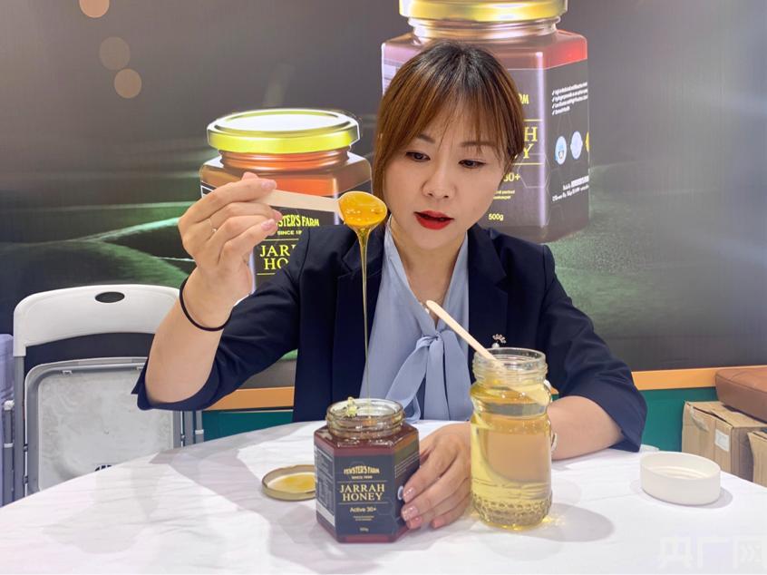 在國際食品和飲料主題館,記者看到洋妝源總裁助理張鳳怡正在以濃稠度、香味、色澤為標(biāo)準(zhǔn),將西澳菲斯特農(nóng)場(chǎng)赤桉蜂蜜與市面上的一款普通蜂蜜進(jìn)行對(duì)比。