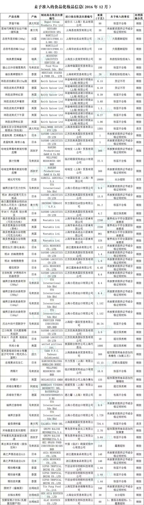 央廣網(wǎng)上海2月10日消息 上海出入境檢驗(yàn)檢疫局今天公布去年12月份未予準(zhǔn)入的進(jìn)境食品、化妝品信息,包括法國產(chǎn)的總統(tǒng)布里奶酪、泰國產(chǎn)的福樂果牌櫻桃干、英國產(chǎn)的瑋致活原味紅茶、德國產(chǎn)的歌薇染發(fā)膏、澳大利亞產(chǎn)的澳莉芙澳優(yōu)純橄欖皂等。未予準(zhǔn)入的產(chǎn)品都已依法作退貨或銷毀處理。