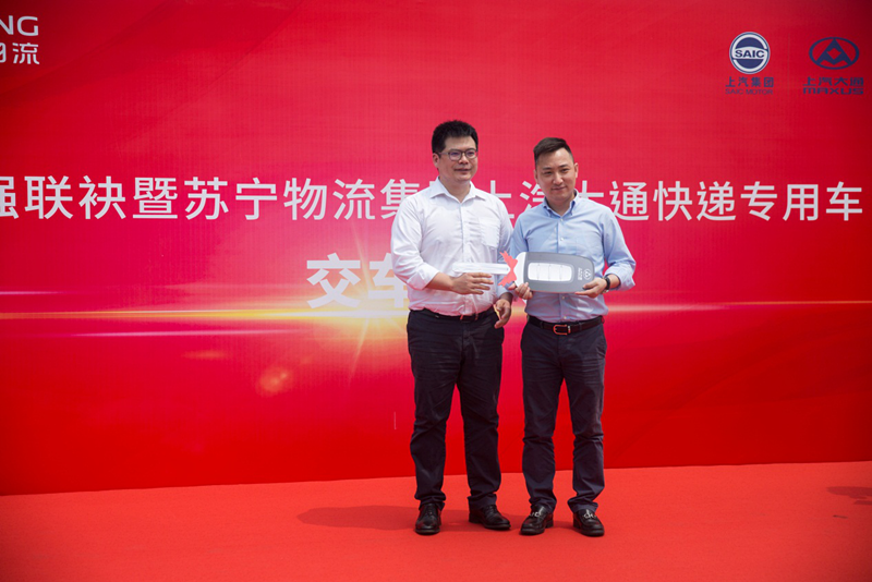 5月18日上午10點(diǎn),上海蘇寧易購總經(jīng)理徐海瀾(右)與上汽銷售副總經(jīng)理薛正華(左)完成快遞專用車鑰匙交接儀式