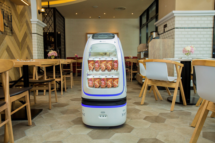 不僅如此,在智慧餐廳的點餐方式也不拘一格。除了手機小程序點單,在投影互動點餐區(qū),還可以輕松通過投射到墻面的菜單自助快速點餐。餐廳里巡弋著的貨郎機器人身裝品類豐富的飲料,隨時等待大家的召喚。