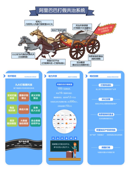 阿里巴巴集團(tuán)首席平臺(tái)治理官鄭俊芳說,這些年來,阿里從遵循“通知-刪除”國(guó)際通用原則被動(dòng)處理假貨投訴,到主動(dòng)運(yùn)用技術(shù)識(shí)別可疑商品,再到組建打假特戰(zhàn)隊(duì)圍剿線下假貨源頭,成立云劍聯(lián)盟、AACA,與執(zhí)法部門合辦的共治共享課堂,已建成一套以數(shù)據(jù)技術(shù)技術(shù)為依托,執(zhí)法機(jī)關(guān)、品牌權(quán)利人、平臺(tái)緊密聯(lián)動(dòng)的知產(chǎn)保護(hù)基礎(chǔ)設(shè)施。