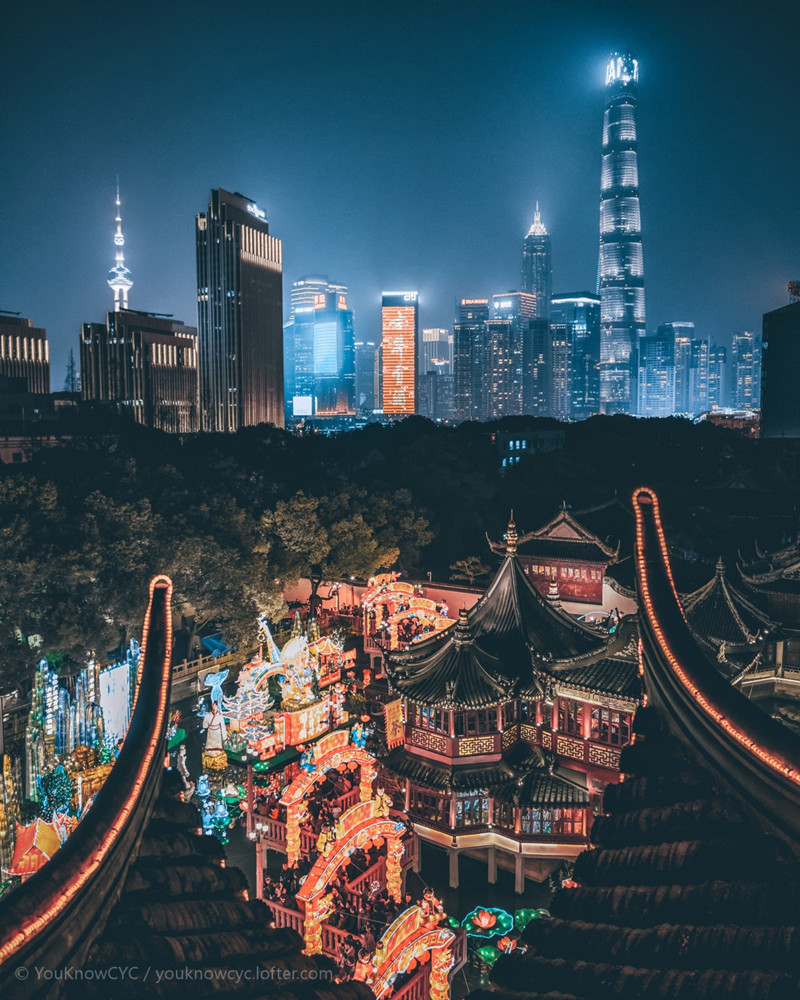 從豫園的城隍廟往黃浦江看去,歷史的美感映照著國際都市的璀璨。