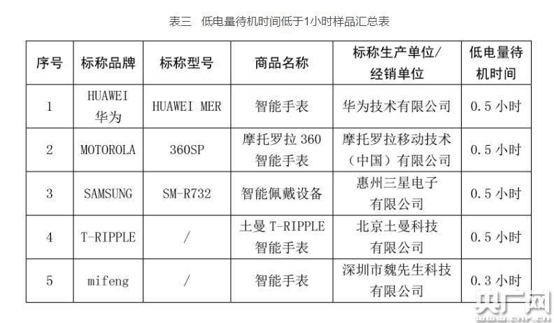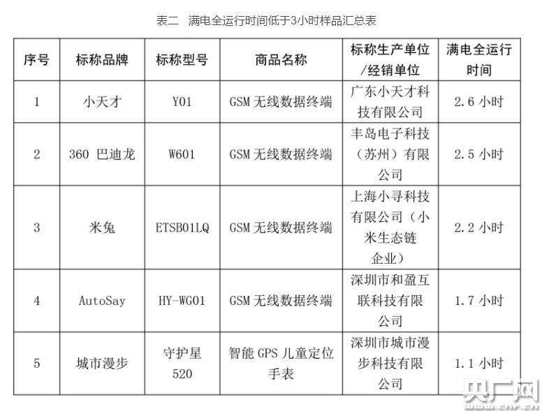 測試結(jié)果顯示,20塊樣品的滿電全運行時間均不超過10小時,最長的為9.2小時,最短的為1.1小時。其中僅2塊樣品達到8小時以上,5塊樣品低于3小時且都為兒童智能手表(詳見表二)。