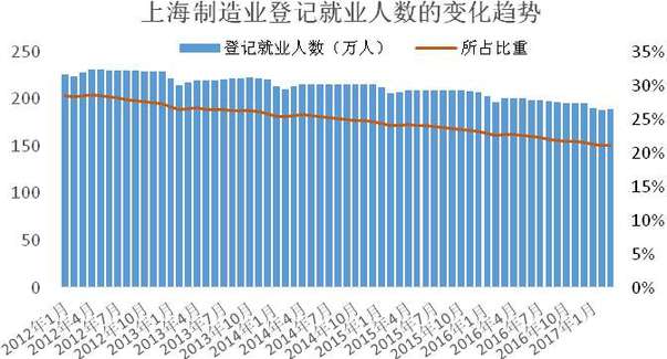據(jù)介紹,2017年3月,上海制造業(yè)登記就業(yè)人數(shù)為189.8萬(wàn)人,同比減少5.3%。其中,外省市來滬人員共110.3萬(wàn)人,與五年前同期水平相比累計(jì)減少14.8萬(wàn)人,下降幅度為11.8%。從近年來的變化趨勢(shì)看,上海制造業(yè)登記就業(yè)人數(shù)總體呈現(xiàn)震蕩下行的趨勢(shì)。制造業(yè)登記就業(yè)人數(shù)占上海登記就業(yè)總?cè)藬?shù)的比重,也從2012年3月的28.4%,下降到2017年3月的21.2%。