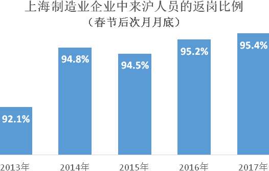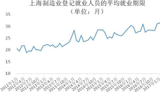 統(tǒng)計(jì)數(shù)據(jù)顯示,上海制造業(yè)登記就業(yè)人員的平均就業(yè)期限為30.4個(gè)月,與2012年同期相比上升8.6個(gè)月;平均年齡為36.7歲,比2012年同期高1.7歲,其中高學(xué)歷勞動(dòng)者越來越多。2017年3月,上海制造業(yè)登記就業(yè)人員中,大專以上學(xué)歷的約占23.0%,同比上升1.2個(gè)百分點(diǎn),與五年前同期水平相比上升5.8個(gè)百分點(diǎn)。