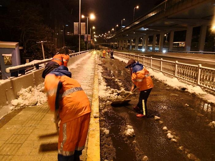 今天,市人大代表陳豪杰早上4時(shí)就起床了,身為一線市容工作者、清道班長(zhǎng),他放心不下,先去了仙霞街道和同事對(duì)接早上的清雪工作。早上6時(shí)許再趕來(lái)參會(huì):“那邊有三座橋,如果不及時(shí)清理,就會(huì)結(jié)凍!标惡澜苷f(shuō),“我離開(kāi)的時(shí)候,其他同事的工作都還在進(jìn)行中!标惡澜芨嬖V記者,今天同組的人大代表們都在為今早的道路清掃工作點(diǎn)贊,他有種滿滿的成就感:“其實(shí),早在一個(gè)禮拜之前,市容局就已經(jīng)通知每個(gè)街道做好應(yīng)對(duì)大雪的應(yīng)急預(yù)案。今天早上,提前準(zhǔn)備的鏟雪板、麻袋和工業(yè)鹽都派上用場(chǎng)。”