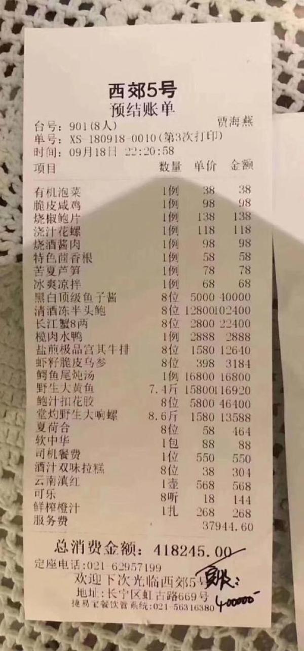 9月19日,一份“天價賬單”在網(wǎng)上引發(fā)關(guān)注。網(wǎng)傳“天價賬單”照片顯示,其出自一家名為“西郊5號”的飯店,位于上海虹古路669號,就餐時間為9月18晚,8人點了20道菜,最后算上服務(wù)費,共花費418245元,實付40萬元。