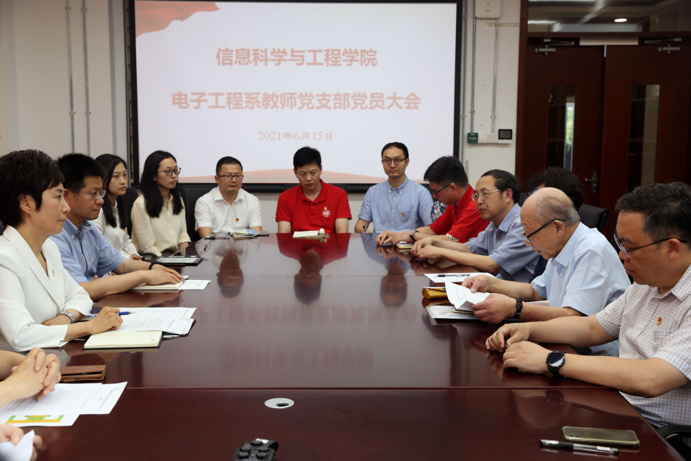6月15日,在復(fù)旦大學(xué)信息科學(xué)與工程學(xué)院電子工程系教師黨支部黨員大會(huì)上,陳振新同志(右二)在宣讀自己的入黨志愿書。(新華社記者劉穎攝)