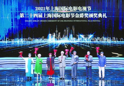 昨晚,第24屆上海國(guó)際電影節(jié)金爵獎(jiǎng)?lì)C獎(jiǎng)盛典在滬舉行。電影表演藝術(shù)家走上舞臺(tái),與觀眾分享他們與電影藝術(shù)的不解之緣,與年輕的電影人分享初心和堅(jiān)守。左起:王曉棠、謝芳、祝希娟、梁波羅、達(dá)式常、童自榮、鄭大里。 迪雯 攝