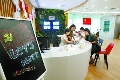 設(shè)在恒隆廣場(chǎng)白領(lǐng)驛家靜安黨建服務(wù)站的“樓小二”正在接待入駐企業(yè)現(xiàn)場(chǎng)咨詢。蔣迪雯 攝