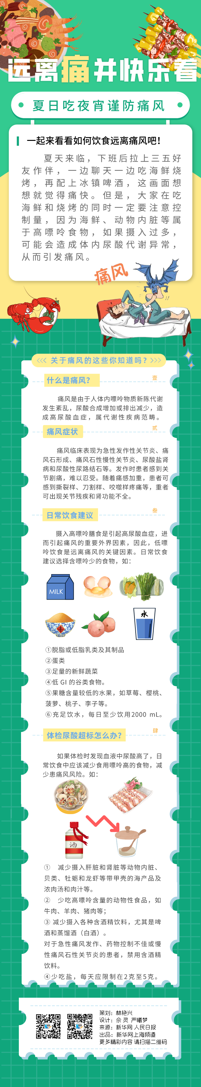 夏天來臨,下班后拉上三五好友作伴,一邊聊天一邊吃海鮮燒烤,再配上冰鎮(zhèn)啤酒,這畫面想想就覺得痛快。但是,大家在吃海鮮和燒烤的同時一定要注意控制量,因為海鮮、動物內(nèi)臟等屬于高嘌呤食物,如果攝入過多,可能會造成體內(nèi)尿酸代謝異常,從而引發(fā)痛風(fēng)。一起來看看如何飲食遠離痛風(fēng)吧。ú邉潱毫制G興;設(shè)計:佘靈 嚴(yán)曦夢)