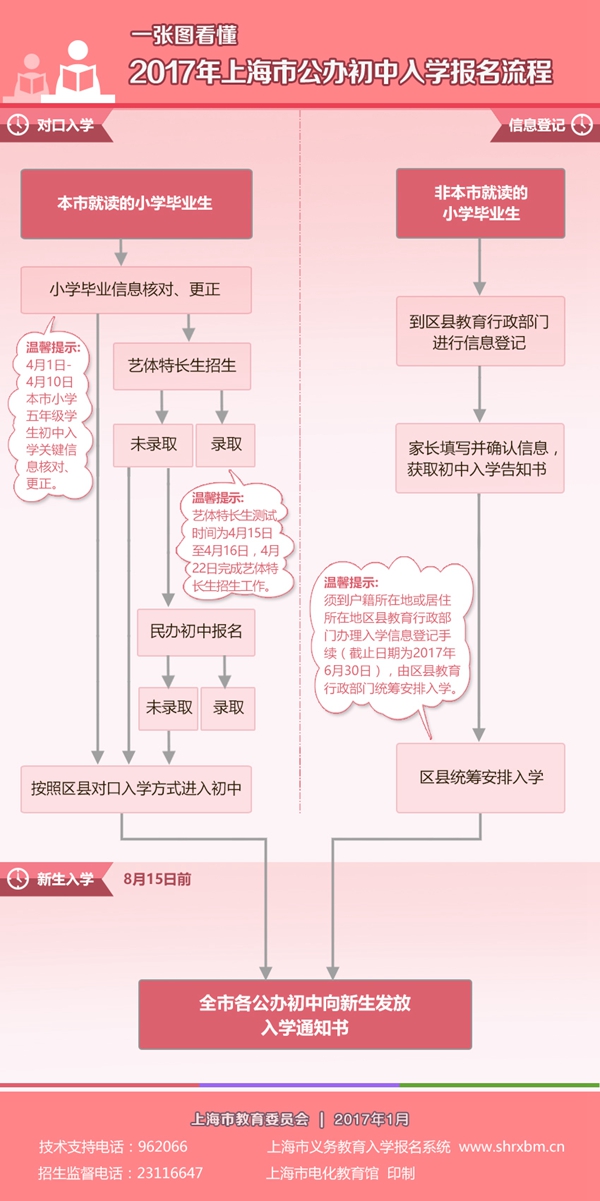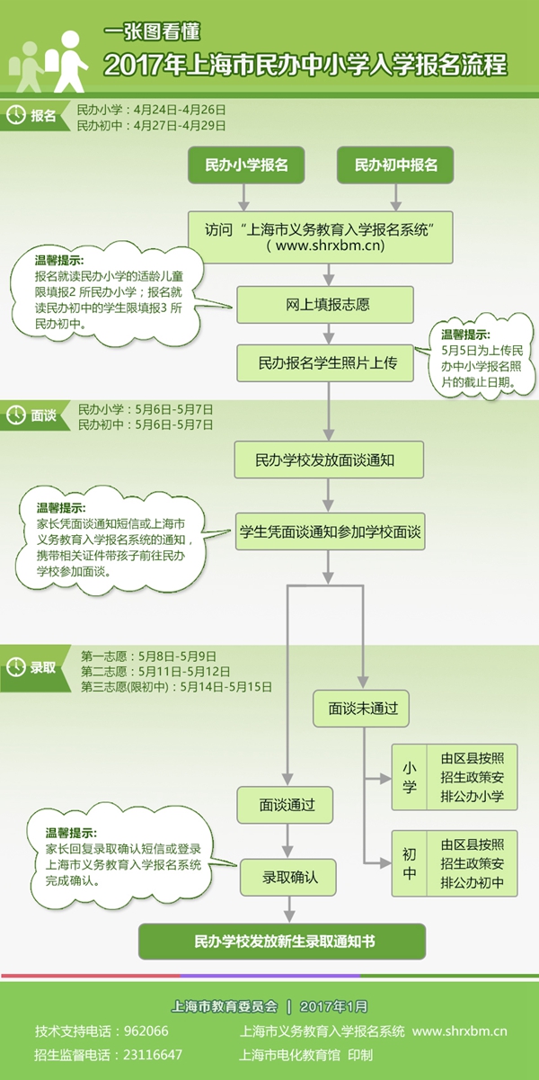 央廣網(wǎng)上海1月6日消息(記者吳善陽 唐奇云) 上海市教委日前公布《2017年本市義務教育階段學校招生入學工作的實施意見》,相關政策整體保持穩(wěn)定,同時另為學生家長附上本市公辦及民辦中小學入學報名流程圖解——