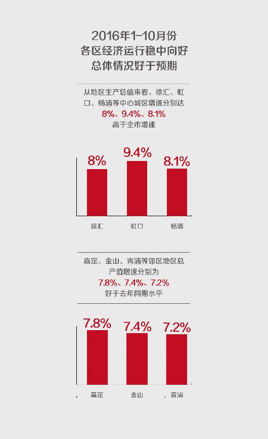 從地區(qū)生產(chǎn)總值來看,徐匯、虹口、楊浦等中心城區(qū)增速分別達(dá)8%、9.4%、8.1%,高于全市增速;嘉定、金山、青浦等郊區(qū)地區(qū)總產(chǎn)值增速分別為7.8%、7.4%、7.2%,好于去年同期水平。