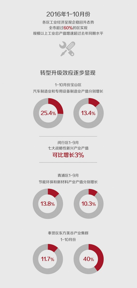 轉(zhuǎn)型升級(jí)效應(yīng)逐步顯現(xiàn)。1-10月份寶山區(qū)汽車制造業(yè)和專用設(shè)備制造業(yè)產(chǎn)值分別增長(zhǎng)25.4%、13.4%;閔行區(qū)1-9月七大戰(zhàn)略性新興產(chǎn)業(yè)產(chǎn)值可比增長(zhǎng)3%;青浦區(qū)1-9月節(jié)能環(huán)保和新材料產(chǎn)業(yè)產(chǎn)值分別增長(zhǎng)13.8%、10.3%;奉賢區(qū)東方美谷產(chǎn)業(yè)集群1-10月份完成總產(chǎn)值同比增長(zhǎng)11.7%,實(shí)現(xiàn)稅收同比增長(zhǎng)約40%。