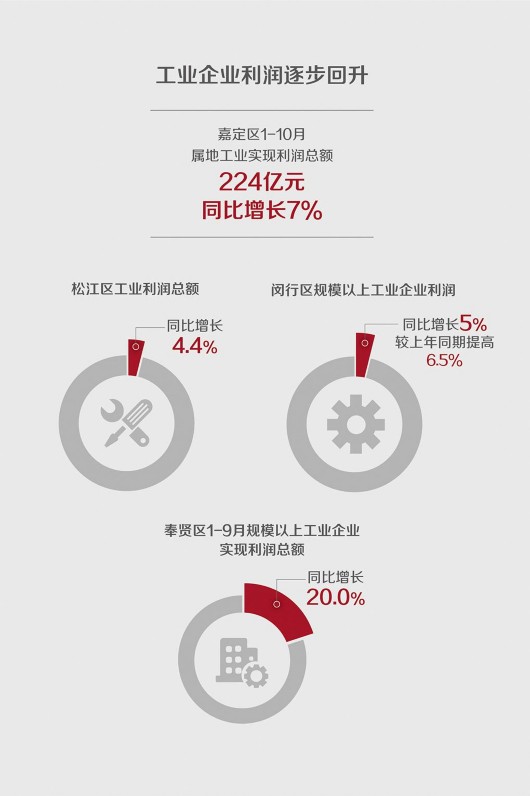 工業(yè)企業(yè)利潤(rùn)逐步回升。嘉定區(qū)1-10月屬地工業(yè)實(shí)現(xiàn)利潤(rùn)總額224億元,同比增長(zhǎng)7%;松江區(qū)工業(yè)利潤(rùn)總額同比增長(zhǎng)4.4%;閔行區(qū)規(guī)模以上工業(yè)企業(yè)利潤(rùn)同比增長(zhǎng)5%,較上年同期提高6.5個(gè)百分點(diǎn);奉賢區(qū)1-9月規(guī)模以上工業(yè)企業(yè)實(shí)現(xiàn)利潤(rùn)總額同比增長(zhǎng)20.0%。