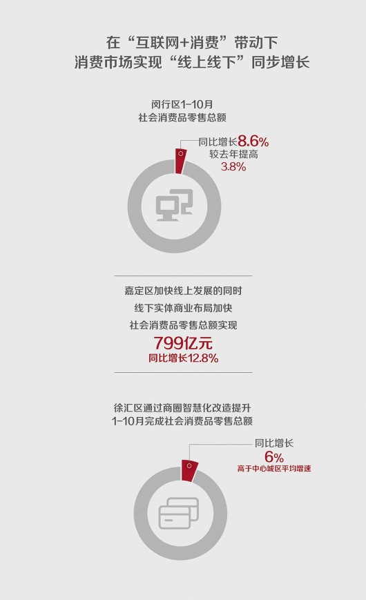 在“互聯(lián)網(wǎng)+消費(fèi)”帶動(dòng)下,消費(fèi)市場(chǎng)實(shí)現(xiàn)“線上線下”同步增長(zhǎng)。閔行區(qū)1-10月社會(huì)消費(fèi)品零售總額同比增長(zhǎng)8.6%,較去年提高3.8個(gè)百分點(diǎn),日用家電在蘇寧云商的帶動(dòng)下零售額增長(zhǎng)近2倍;嘉定區(qū)加快線上發(fā)展的同時(shí),線下實(shí)體商業(yè)布局加快,社會(huì)消費(fèi)品零售總額實(shí)現(xiàn)799億元,同比增長(zhǎng)12.8%,“嘉境通”實(shí)現(xiàn)跨境電子商務(wù)交易額9878.9萬元;徐匯區(qū)通過商圈智慧化改造提升,1-10月完成社會(huì)消費(fèi)品零售總額同比增長(zhǎng)6%,高于中心城區(qū)平均增速。