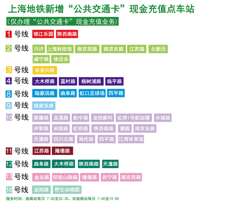 1、新增的50個交通卡現(xiàn)金人工充值點服務(wù)時間:換乘站每日7:00至20:30,非換乘站每日7:00至19:00,僅提供公共交通卡現(xiàn)金人工充值服務(wù),不辦理該卡其他業(yè)務(wù)。