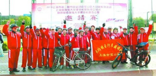 圖片說明:大場鎮(zhèn)自行車騎游隊(duì)參加市民運(yùn)動會時(shí)合影