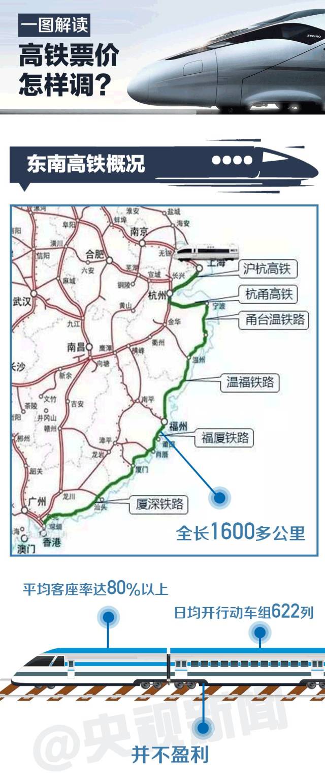東南沿海高鐵是由上海至杭州、杭州至寧波、寧波至深圳三段組成,其中滬杭段全長159公里,杭甬段全長155公里,甬深段全長1309公里。滬杭、杭甬段時(shí)速300公里高鐵動(dòng)車組票價(jià)不在調(diào)整范圍。