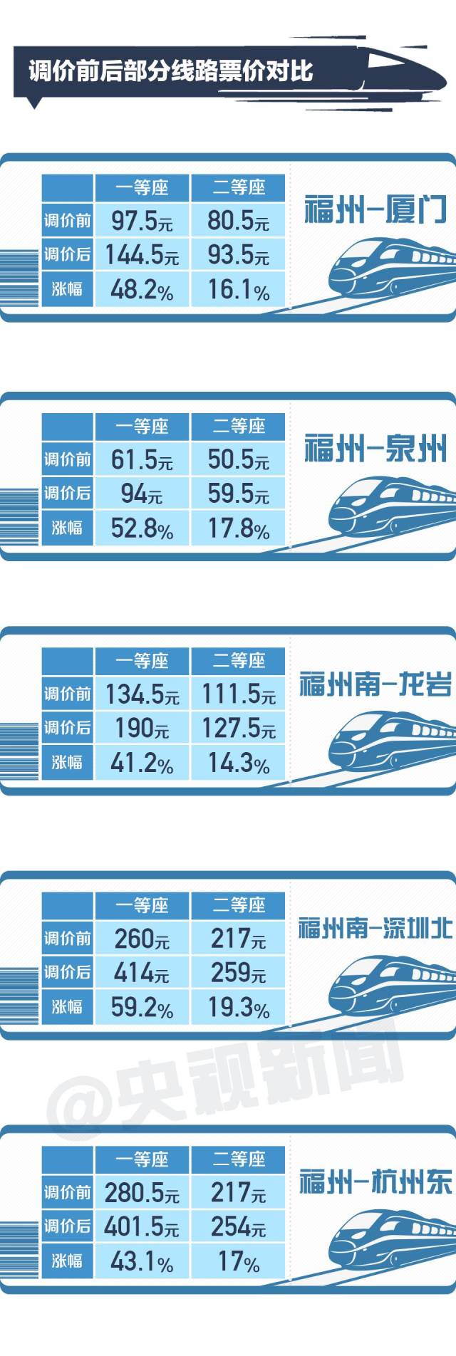 這次調(diào)價(jià)是中國高鐵第一次跨省調(diào)價(jià)。具體怎么調(diào)?會(huì)漲價(jià)嗎?對(duì)百姓出行有何影響?來看看從福州(福州南)始發(fā)到這些地方的票價(jià)漲了多少。