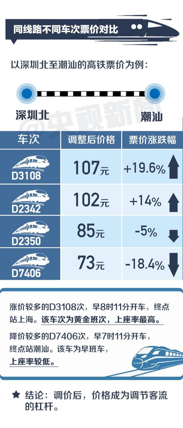 另外,調(diào)價(jià)也不完全等同于漲價(jià)。此次東南沿海高鐵調(diào)價(jià),執(zhí)行票價(jià)是根據(jù)各車次的客流狀況呈現(xiàn)差異化,有漲有降。