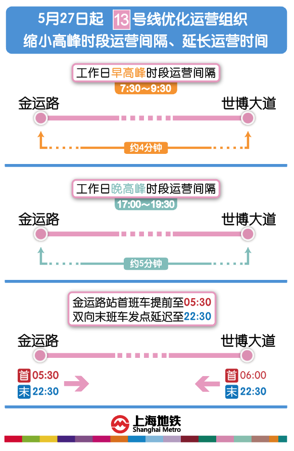 另外,針對網(wǎng)友反映的13號線末班車時間結(jié)束較早的問題,地鐵運(yùn)營方也是高度重視。5月27起,13號線延長了全天運(yùn)營時間,根據(jù)計(jì)劃:啟用新列車運(yùn)行圖后,13號線金運(yùn)路站的首末班車時間由原先的5:50和22:11,調(diào)整為5:30和22:30,調(diào)整后金運(yùn)路往世博大道方向全天運(yùn)營時間增加39分鐘;而13號線世博大道站的首班車時間維持在6:00不變,末班車時間由原先的22:08調(diào)整為22:30,調(diào)整后世博大道往金運(yùn)路方向全天運(yùn)營時間增加了22分鐘。