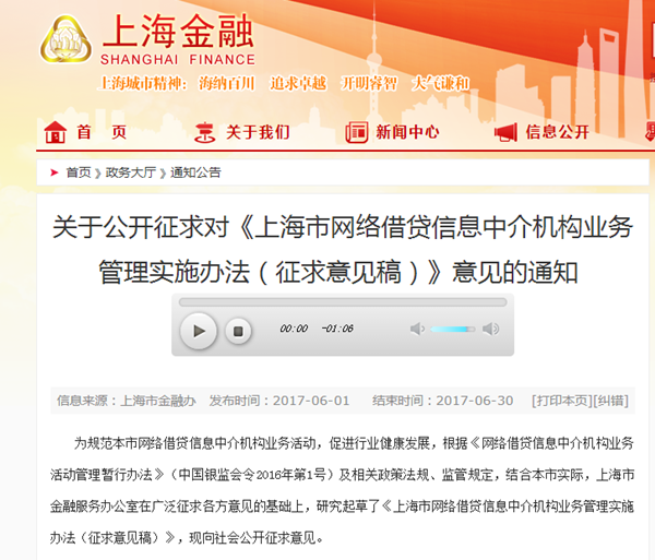 據(jù)中國網(wǎng)消息 6月1日,上海金融辦下發(fā)《上海市網(wǎng)絡(luò)借貸信息中介機(jī)構(gòu)業(yè)務(wù)管理實(shí)施辦法》(征求意見稿)(以下簡稱“征求意見稿”)。