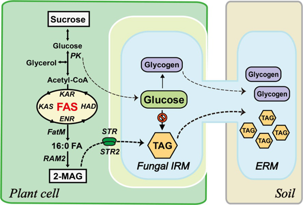中國(guó)科學(xué)院上海植物生理生態(tài)研究所的王二濤團(tuán)隊(duì)通過穩(wěn)定同位素標(biāo)定實(shí)驗(yàn),首次否定了糖是植物傳遞給菌根真菌主要碳源形式。同時(shí),研究者采用遺傳學(xué),分子生物學(xué)及代謝生物學(xué)的手段研究發(fā)現(xiàn),植物宿主的脂肪酸合成對(duì)于叢枝菌根真菌共生是必須的,并且植物合成的脂肪酸能夠直接傳遞給菌根真菌。進(jìn)一步的研究發(fā)現(xiàn)植物基因合成的一類特殊脂肪酸分子,被植物的轉(zhuǎn)運(yùn)蛋白轉(zhuǎn)運(yùn)給菌根真菌。該研究系統(tǒng)揭示了脂肪酸是光合作用碳源的主要傳遞形式,推翻了傳統(tǒng)認(rèn)識(shí),對(duì)于理解生態(tài)系統(tǒng)的碳氮循環(huán)具有重要的意義。