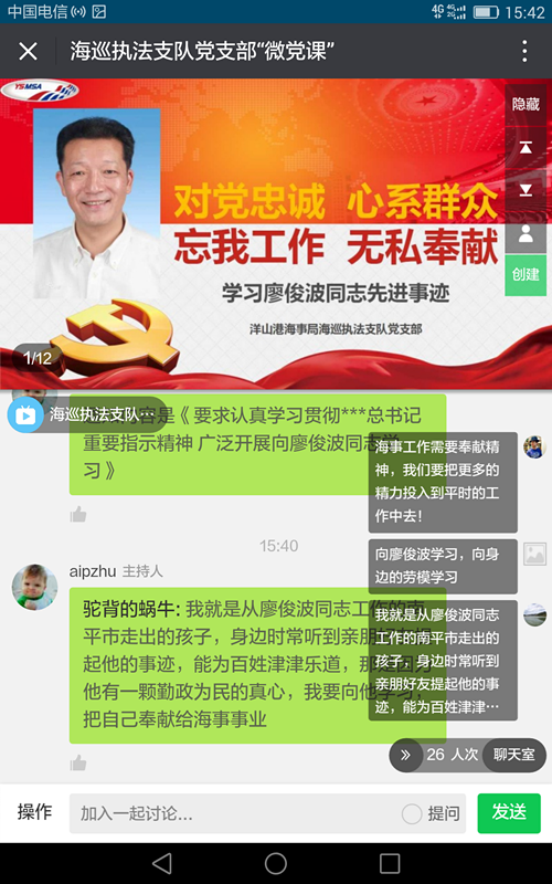 “以前支部上黨課,要把大家集中到會議室里學(xué)習(xí),不僅因為黨員崗位分布廣難以集中,而且學(xué)習(xí)效果還不太理想,F(xiàn)在方便了,大家隨時隨地掏出手機(jī)打開微信,就可以在線觀看黨課直播,進(jìn)行互動學(xué)習(xí),更方便更有效了!苯眨笊礁酆J戮趾Q矆(zhí)法支隊的黨員小朱高興地告訴記者。