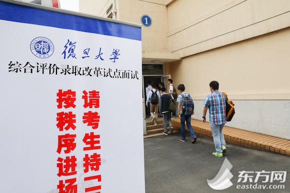 圖片說明:參加復(fù)旦大學(xué)綜合評(píng)價(jià)錄取改革試點(diǎn)校測(cè)面試的考生們正在有序進(jìn)場(chǎng)。慕梁攝
