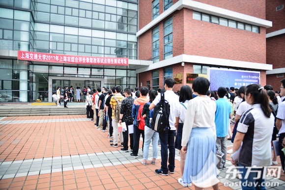 圖片說明:參加上海交通大學(xué)2017年綜合評(píng)價(jià)錄取改革試點(diǎn)校測(cè)面試的考生們,正在考場(chǎng)外列隊(duì)有序等待進(jìn)入。魏楨琦攝