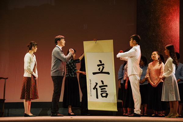 一是師生即演員,在投入排演中領(lǐng)悟大師精神真諦。在“大師劇”創(chuàng)作和演出過(guò)程中,高校師生不僅僅只是受眾對(duì)象,他們更是“大師劇”的排演者、創(chuàng)作者、傳播者。例如,東華大學(xué)2015年《錢(qián)寶鈞》劇首演的所有演員均來(lái)自于上海高校,尤其是兩位錢(qián)寶鈞扮演者,分別為東華大學(xué)表演系老教授和青年教師,還有一大批表演系本科生參加了演出。,在編、排、演、觀的過(guò)程中,高校師生以自我教育的形式實(shí)現(xiàn)了“入芝蘭之室久而自芳”的效果。比如,飾演大師劇《潘序倫》劇中顧準(zhǔn)一角的朱延鈺同學(xué),在深切感受了中國(guó)現(xiàn)代會(huì)計(jì)之父、上海立信會(huì)計(jì)金融學(xué)院首任校長(zhǎng)潘序倫先生風(fēng)云跌宕、跨越九十載的傳奇人生后說(shuō):“我深深感受到<潘序倫>這部劇并不單單是一部文獻(xiàn)劇,它更蘊(yùn)含著立信人的魂”。上海交通大學(xué)密西根學(xué)院學(xué)生萬(wàn)一說(shuō):“《錢(qián)學(xué)森》這部劇對(duì)我來(lái)說(shuō)不僅僅是一項(xiàng)演出任務(wù)、一份交大人的責(zé)任,更影響了我自己人生的軌跡。曾經(jīng)出國(guó)留學(xué)對(duì)我而言,意味著國(guó)外的高薪工作和安逸生活,而現(xiàn)在我覺(jué)得學(xué)成回來(lái),報(bào)效祖國(guó)才能真正實(shí)現(xiàn)我的理想,發(fā)揮我的價(jià)值”。