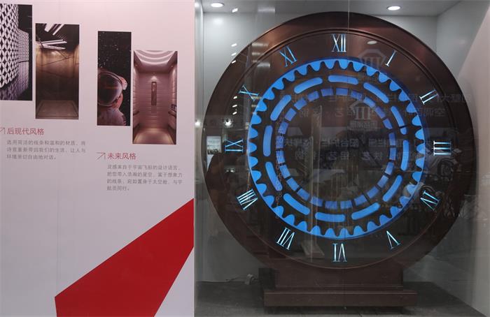 現(xiàn)場(chǎng)展示中還別出心裁地將轎廂與古典時(shí)鐘相結(jié)合,時(shí)鐘指向19:12分,寓意迅達(dá)第一臺(tái)住宅電梯誕生的年份1912年,F(xiàn)代時(shí)尚碰撞古老經(jīng)典,引領(lǐng)新的設(shè)計(jì)風(fēng)尚。