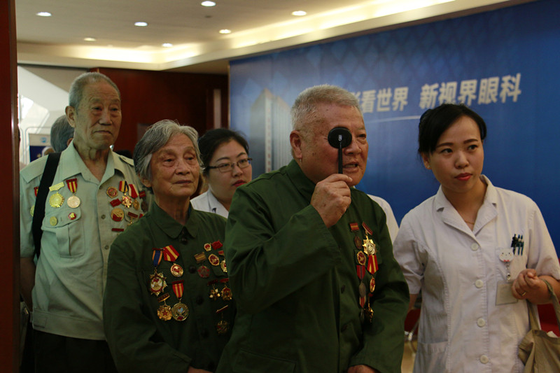 抗戰(zhàn)老兵在護(hù)士陪同下檢查視力