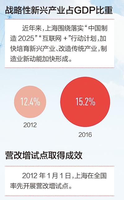 過去5年,上海全市生產(chǎn)總值年均增長7.2%,2016年超2.7萬億元;第三產(chǎn)業(yè)增加值占比上升到目前的70%左右,服務(wù)業(yè)為主的產(chǎn)業(yè)結(jié)構(gòu)基本形成;戰(zhàn)略性新興產(chǎn)業(yè)加快發(fā)展,2016年,占全市生產(chǎn)總值比重達到15.2%。