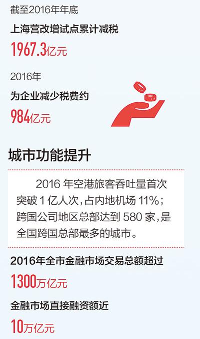 發(fā)展活力看什么?看市場主體。近幾年,上海新增企業(yè)比例、企業(yè)活躍度都很高。2012年年初,上海率先試點營改增,截至2016年年底,累計減稅1967.3億元。去年,我們著力降低制度性交易成本,采取了一系列減稅降費措施,為企業(yè)減少稅費約984億元,今年預(yù)計再減負超過400億元。創(chuàng)新轉(zhuǎn)型不會一蹴而就,我們將更加積極主動適應(yīng)和引領(lǐng)新常態(tài),堅持以供給側(cè)結(jié)構(gòu)性改革為主線,向深化改革要活力,向全面創(chuàng)新要動力,向結(jié)構(gòu)調(diào)整要助力,向資源節(jié)約和環(huán)境保護要推力。