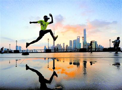 外灘的清晨,一位市民迎著晨曦奔跑!∫曈X(jué)中國(guó)供圖