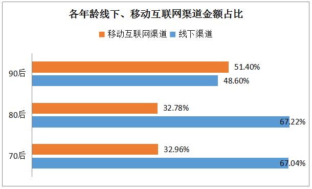 從2017年各年齡在移動互聯(lián)網(wǎng)渠道及線下實(shí)體渠道的消費(fèi)金額占比來看,90后移動互聯(lián)網(wǎng)渠道消費(fèi)金額占比51.40%,已超過消費(fèi)金額的一半;而70、80后線下實(shí)體渠道消費(fèi)仍為核心,消費(fèi)金額分別占比67.04%、67.22%。