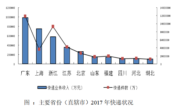 據(jù)統(tǒng)計,近十年來,我國快遞行業(yè)的業(yè)務(wù)量年均增長速度超過了40%,由2006年的十億件左右增長至2017年400.6億件左右, 快遞業(yè)務(wù)量占全球業(yè)務(wù)量的一半以上,已經(jīng)成為全球最大。同時2017年我國快遞行業(yè)收入達(dá)到了4957.1億元人民幣。根據(jù)國家郵政局《2017年郵政行業(yè)發(fā)展統(tǒng)計公報》的數(shù)據(jù)顯示上海2017年的快遞業(yè)務(wù)量為31.15億件,快遞行業(yè)收入為868.89億元人民幣。