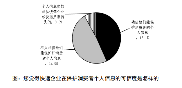 半數(shù)以上的消費者擔(dān)憂快遞公司無法有效保護(hù)消費者的個人信息調(diào)查數(shù)據(jù)顯示,約有48.6%的消費者表示“不太相信他們能保護(hù)好消費者個人信息”,8.3%的消費者認(rèn)為“個人信息多數(shù)是從快遞企業(yè)或快遞員那流失的”。